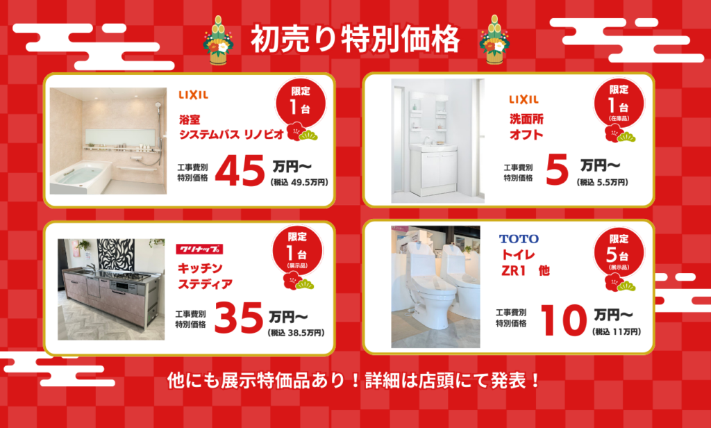 LIXILのシステムバスが45万円〜(税込49.5万円/工事費別)など、初売り特価の商品を多数ご用意しています。
